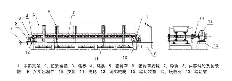 電動機啟動后經(jīng)減速裝置減速,經(jīng)過聯(lián)軸器將動力傳到主動軸上,主動軸上的鏈輪帶動鏈輪轉(zhuǎn)動,同時頭尾裝置中與鏈輪相咬合的鏈條隨主副鏈輪轉(zhuǎn)動,