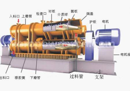 振動磨機由雙圓筒依靠聯(lián)接板固定成一體,聯(lián)接板上同時固定著激振器,且激振器需通水冷卻,雙圓筒由隔振彈簧支承,彈簧支座固定在不參振的底架上。由電動機通過撓性聯(lián)軸器和萬向聯(lián)軸器帶動激振器的軸旋轉(zhuǎn),激振器的軸上帶有偏心塊,由于帶偏心塊軸的旋轉(zhuǎn)使雙圓筒做近似的圓振動。筒體內(nèi)充填研磨介質(zhì)(鋼球或鋼棒)和待粉磨物料,物料既可從上圓筒的進料口進入,上圓筒內(nèi)粉磨完畢的物料流入下圓筒繼續(xù)粉磨,最后從下圓筒的出料口排出,即單進單出;物料也可同時進入上下圓筒進行粉磨,然后同時排出,即雙進雙出或雙進四出。筒體做圓振動時,筒內(nèi)的介質(zhì)和物料在筒內(nèi)翻轉(zhuǎn),互相沖擊,這種有規(guī)律的翻轉(zhuǎn)、沖擊和介質(zhì)的自轉(zhuǎn),使物料在短時間內(nèi)得到粉碎,并達到理想的粉碎效果,圓筒筒體由外筒、內(nèi)襯筒和端蓋組成。內(nèi)襯筒是可更換的,由耐磨材料制成。 ZM系列振動磨的激振器由四組主副偏心塊組成,調(diào)整副偏心塊和主偏心塊的相位角,可改變激振力的大小,從而達到調(diào)整振幅大小的目的,振動磨雙振幅的近似值可以從振幅標示牌上讀出。圓筒內(nèi)的粉磨介質(zhì)有鋼球或鋼棒兩種。相同直徑和級配的情況下,鋼棒做介質(zhì)時的產(chǎn)率要高于鋼球做介質(zhì)時的產(chǎn)率。因為用鋼球做介質(zhì)時,要達到同樣的粉狀粒度,粉磨時間較長,但鋼球做介質(zhì)時能達到更細的粒度。振動磨常用介質(zhì)為Φ16-Φ36mm的鋼棒,鋼棒應(yīng)經(jīng)過滲碳和淬火,表面硬度應(yīng)達到HRC55以上。入料粒度>15mm時取較大直徑,入料粒度<15mm時取較小直徑,并采用兩種不同直徑鋼棒的混合級配較好。