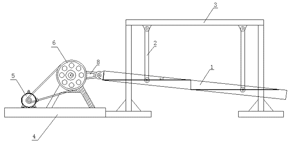 1、網(wǎng)架  2、懸吊裝置 3、支撐梁 4、傳動(dòng)底托 5、傳動(dòng)電機(jī)  6、 偏心往復(fù)裝置 8往復(fù)臂