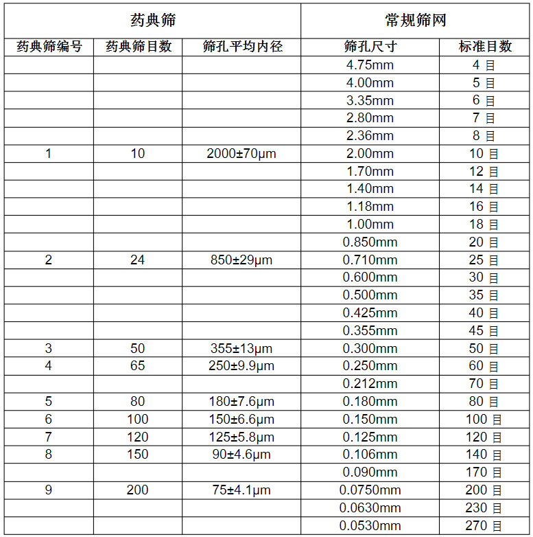 標(biāo)準(zhǔn)藥典篩常規(guī)篩孔徑網(wǎng)目數(shù)對照表