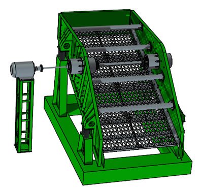 單軸振動篩有一個十分牢靠的篩箱,因為其結(jié)構(gòu)是焊接及鉚接而成,在振動器的主軸上不僅中間位置有偏心軸,而且主軸兩頭也有能夠調(diào)節(jié)的偏心輪。在篩分時,電動機經(jīng)由三角帶作用于振動器,傳動軸使偏心軸及偏心輪產(chǎn)生慣性力,這種慣性力會令篩箱作近似的圓形的運動,使物料得到了最佳的篩分效果。