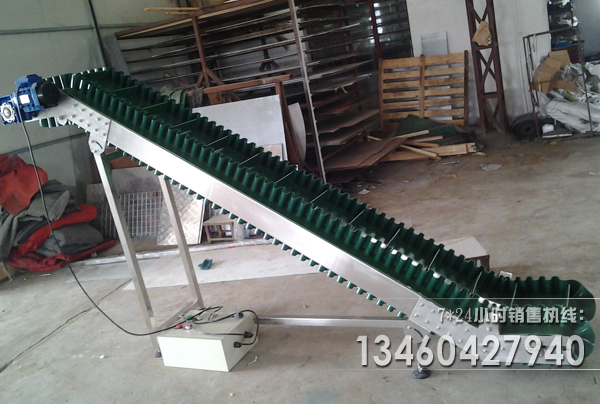 b)擋邊皮帶輸送機(jī)用于斜坡輸送,可以把低處產(chǎn)品提升到一定的高度,用于物料提升,在提升的過程中,可以將散料放在一格一格里面,在傾斜的角度中,不會滑;