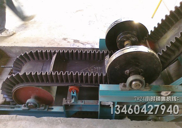 a)大傾角擋邊皮帶輸送機(jī)工作原理就是在平面的輸送上面分成一格一格的,在皮帶中間焊有一條條的擋板,在皮帶的兩邊焊的波狀擋邊形成一體,用來輸送散料;
