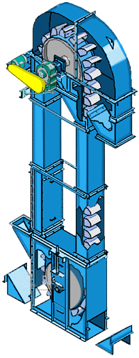 TB系列垂直斗式提升機啟動后,料斗把物料從下面的儲藏中舀起,隨著輸送鏈提升到頂部,繞過頂輪后向下翻轉(zhuǎn),然后將物料傾入接受槽內(nèi)。