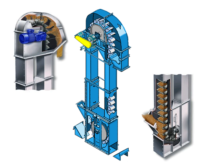 NE提升機主要是將料斗安裝在鏈條上,然后隨著齒輪的滾動,帶動鏈條的運動從而帶動了料斗進行旋轉移動,利用這樣的運動軌跡料斗剛好能夠完成,進料口物料的流入,從而實現(xiàn)料斗的入料,隨著鏈條的運動和料斗的翻轉從而實現(xiàn)了物料的輸送于卸料。